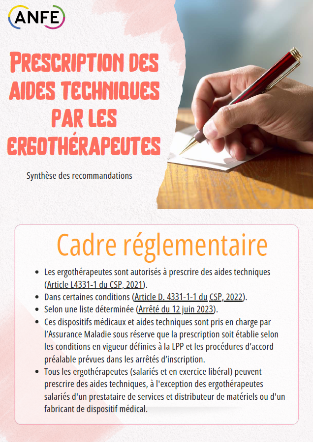 Suite à ces travaux, et grâce à la mobilisation des bénévoles et adhérents de l’ANFE, les ergothérapeutes ont obtenu le droit à la prescription des aides techniques par l’intermédiaire de La Loi n° 2021-502 du 26 avril 2021 visant à améliorer le système de santé par la confiance et la simplification qui a modifié l’article L4331-1 du code de la Santé publique.